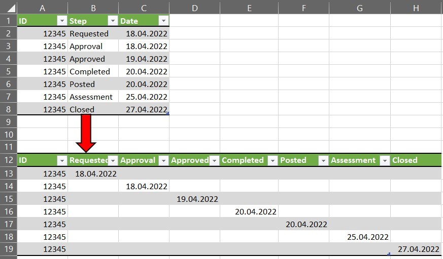 We added more data to the given sample table to better show how it works, also considering that some IDs might not have all the Steps completed.