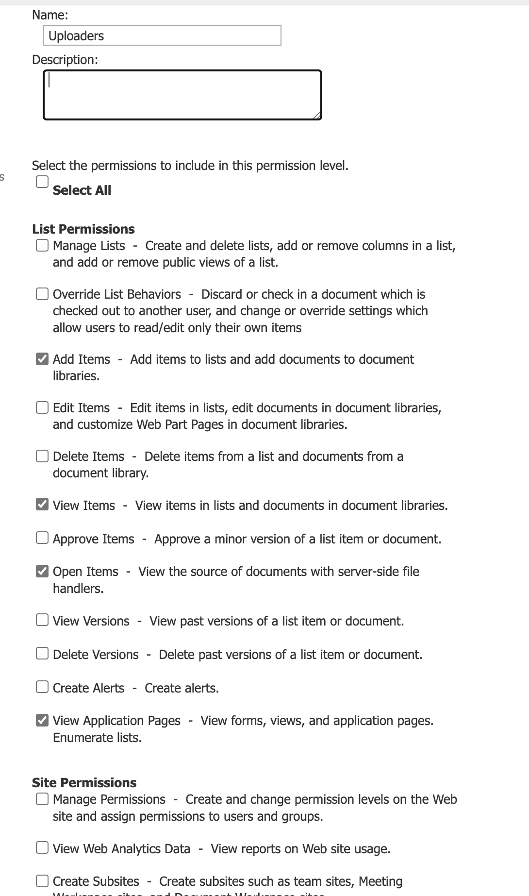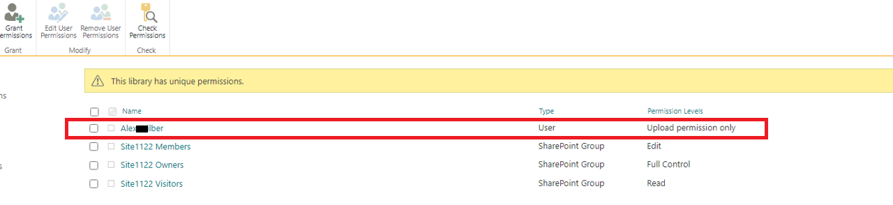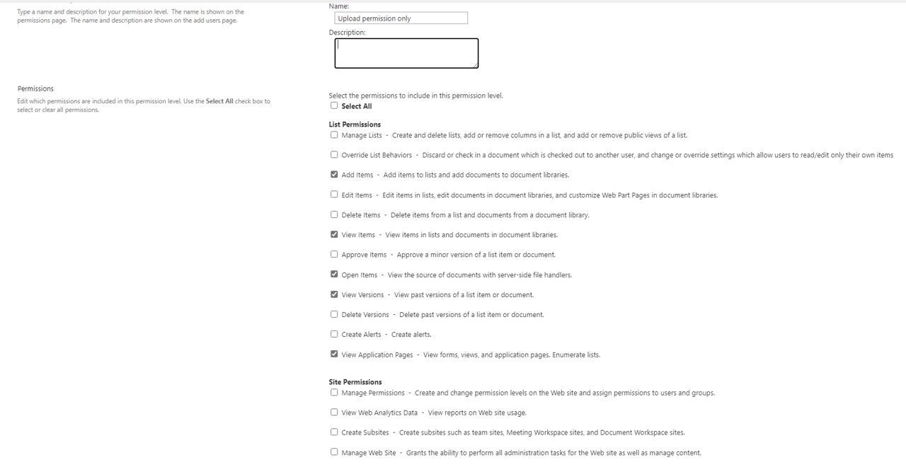 Site permissions>Grant Permissions>Invite people and type the user's email address> SHOW OPTIONS>select the new permission e.g. I named Upload>click Share