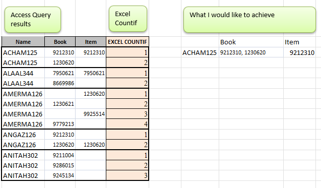 I have a database in which I am able to get a query that gives me the results of my data. Currently the results are in a stacked format. Is there a way that I could create a query that will enable me to eventually get the "stacked" results in a single line format? In excel I could use the countif formula and then combine the data.