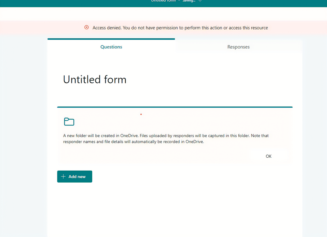 Error message "Access denied. You do not have permission to perform this action or access this resource" appears when creating a Upload File question in Microsoft Forms.