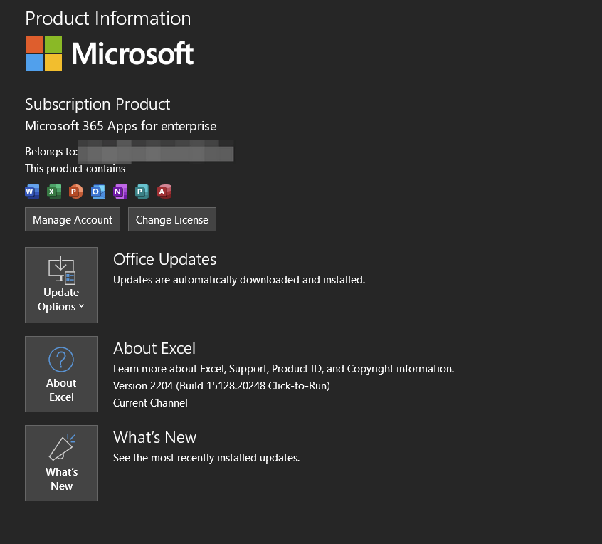 2.To confirm whether this is a bug in a specific version, please provide us the version information. To check version: Open Excel>File>Account>Product Information and capture a full screenshot and share here (Please mask your private information) and we will be tested on that version and verify the result with you.