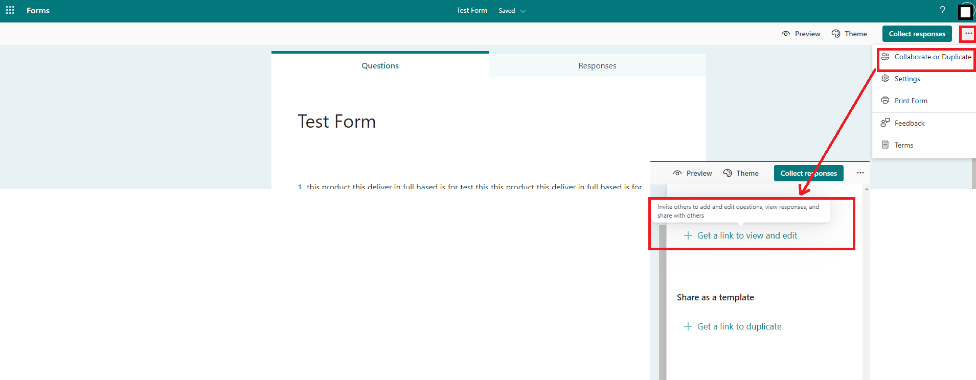 If you are using work/school account and in order to share a Microsoft Form to another user, you may click on Collaborate or Duplicate> and under Share to collaborate you can get link and share with other users via email.