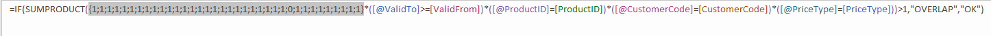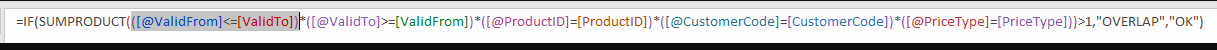 =IF(SUMPRODUCT(([@ValidFrom]<=[ValidTo])*([@ValidTo]>=[ValidFrom])*([@ProductID]=[ProductID])*([@CustomerCode]=[CustomerCode])*([@PriceType]=[PriceType]))>1,”OVERLAP”,”OK”)