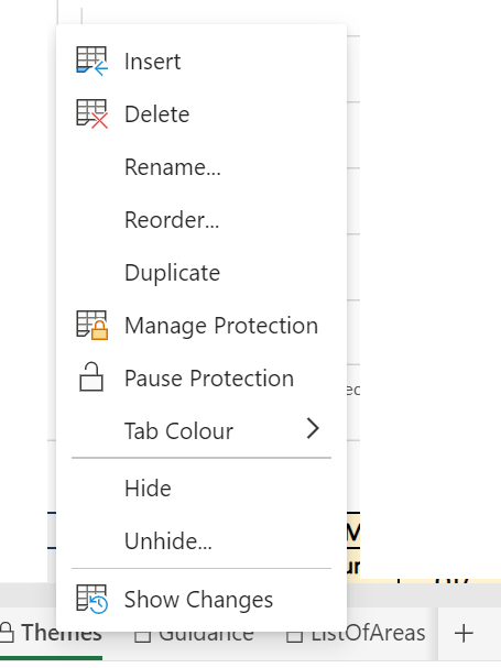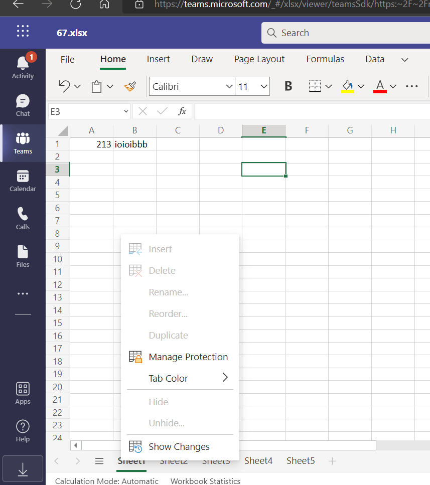 2.If a user right click a sheet in the workbook in Teams, what options do they get? Could you share a screenshot when a user right click the sheet?