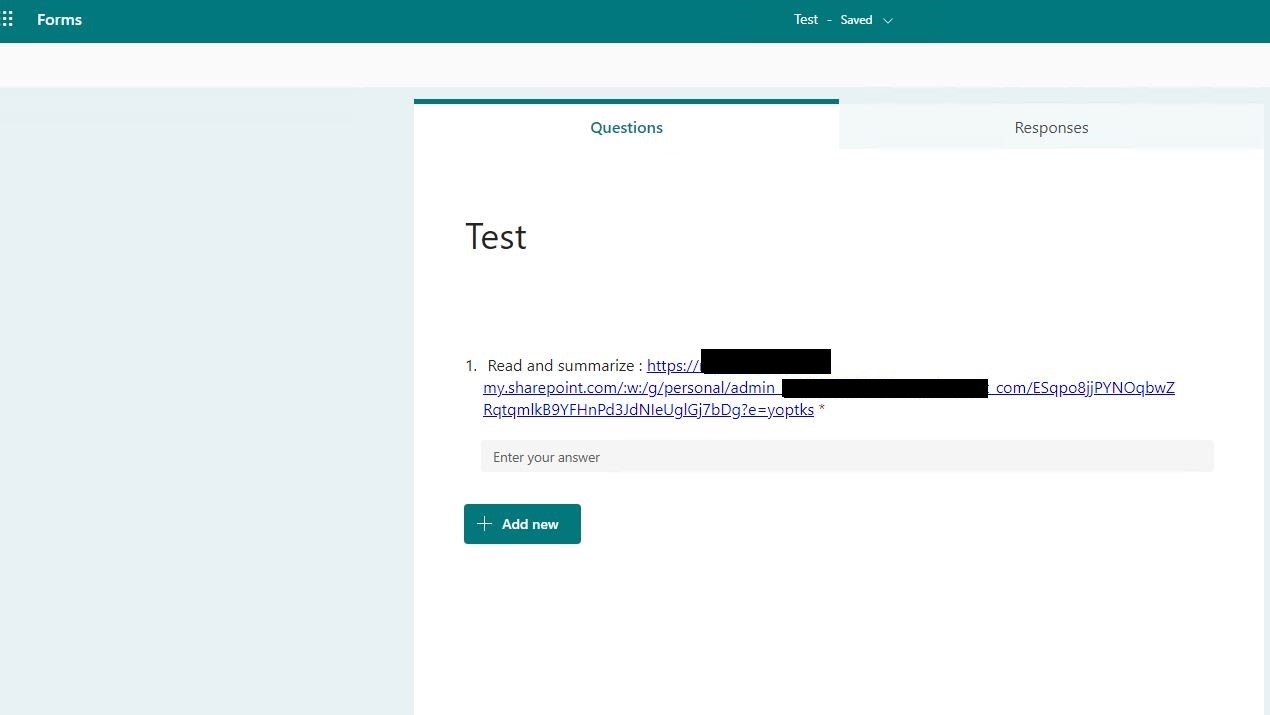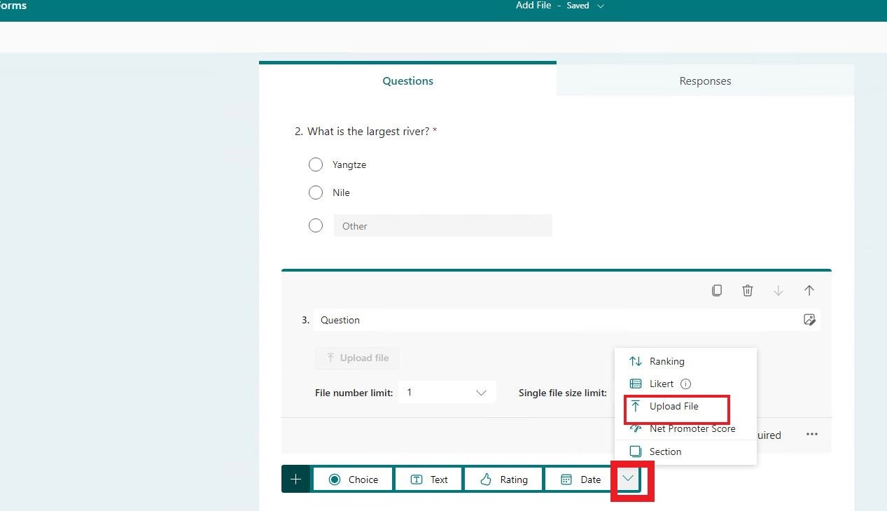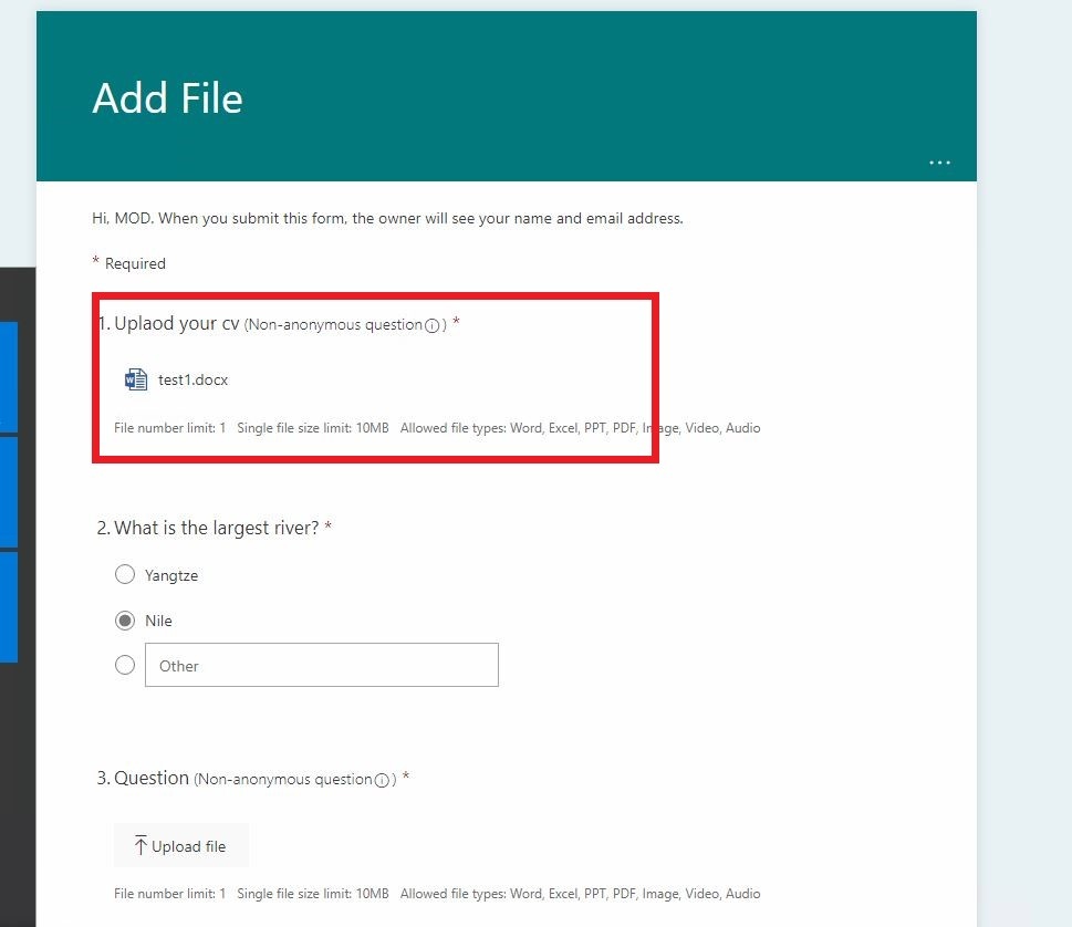 To let the responders share files, you can Add questions allowing file uploads. Add a new question by selecting Add button; add new.> SelectMore question types, and then select File upload. Here is a link with more information: : Add questions allowing file uploads (microsoft.com).