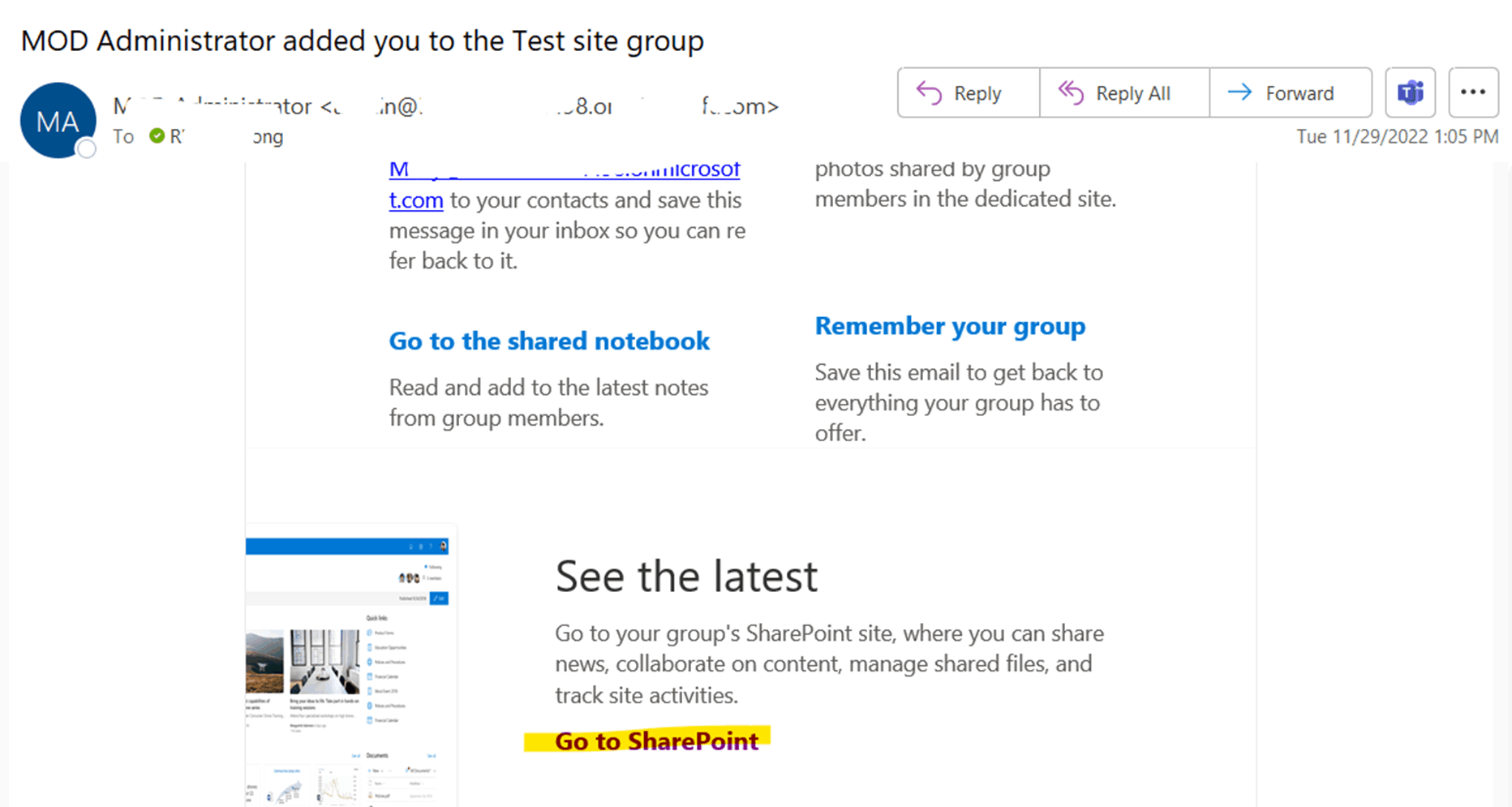 And the added member can access the site by clicking "Go to SharePoint" as shown below: