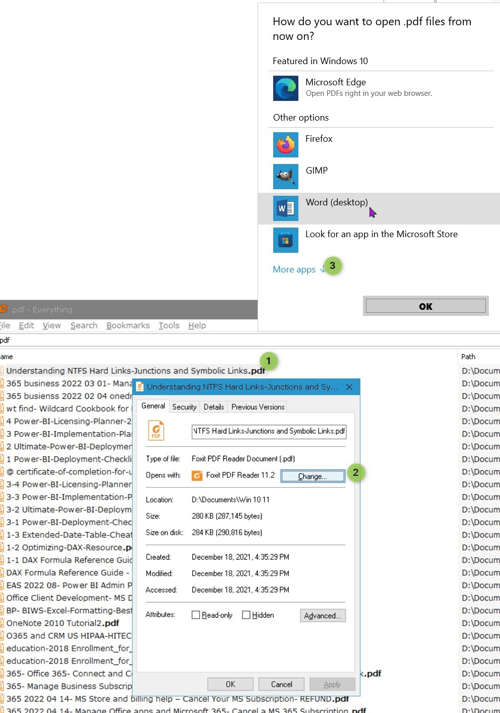 In File Explorer, find your PDF #1 > right click on it > Select Properties > General Tab if it does not say Adobe, click on the "Change ..." button #2, then select Adobe from the list or click on "More Apps ..." hyperlink #3 to find Adobe on your computer.