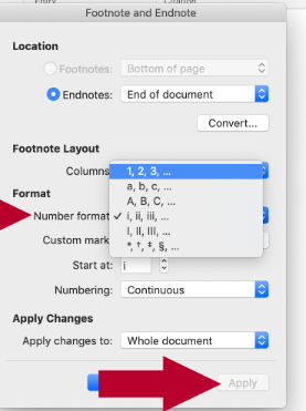 In Word on a Mac, Right-click into an endnote, then select Footnote... from the context menu: Using the drop-down menu under Number format, switch to your preferred style of numeral; then click the Apply button.