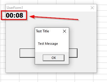 It works good but I would also like to have an active countdown in the Userform behind the message box as indicated by the red arrow (So it should be something like 00:08...00:07...00:06...00:05 and so on)