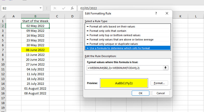 I am trying to make a rule with conditional formatting that would highlight an entire row based on dates occurring this week (in another column). I have my dates set up to show only Mondays (ex: 1/1, 1/8) in column B (screenshot below)