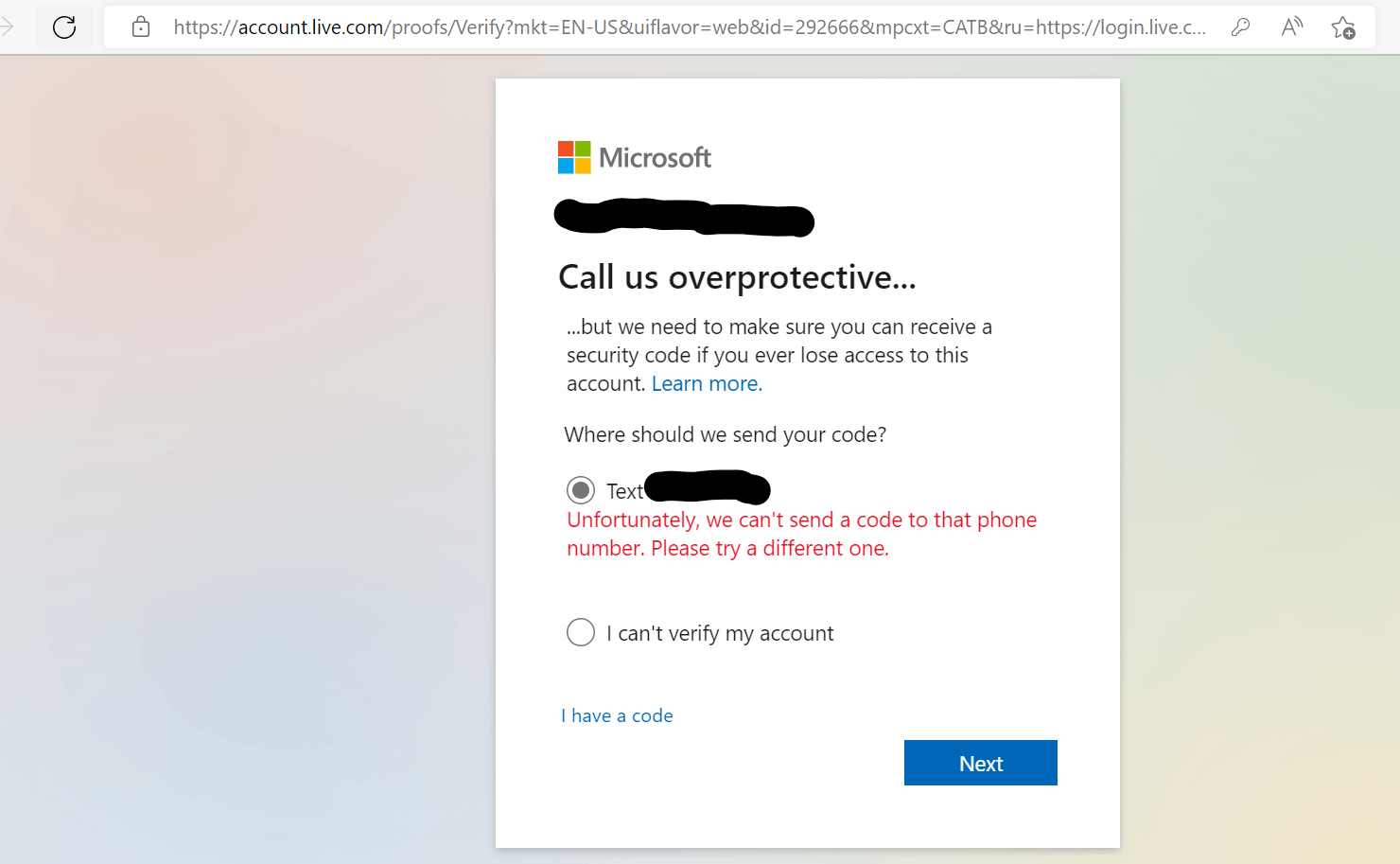 I have been trying to login to my Microsoft account and as per the process, I should receive the verification code on my mobile number, post keying in the password. But there is an error message saying " Unfortunately, we can't send a code to that phone number. Please try a different one."