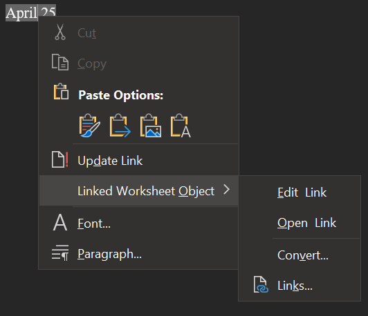 On the day I paste the link, when right clicking on the link, I see the following menu that contains the Update Link and Linked Worksheet Object items.