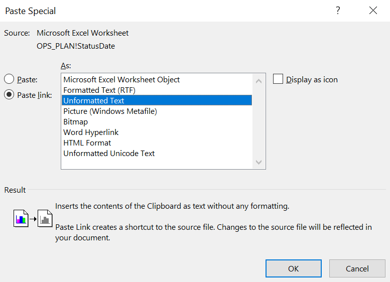I create the link in Word by copying the desired Excel cell (which has a defined named) and going to Word -> Paste Special -> Unformatted Text. (A note: when pasted as a Microsoft Excel Worksheet Object, the link remained active after a day; however, the formatting is incompatible with the Word report.)