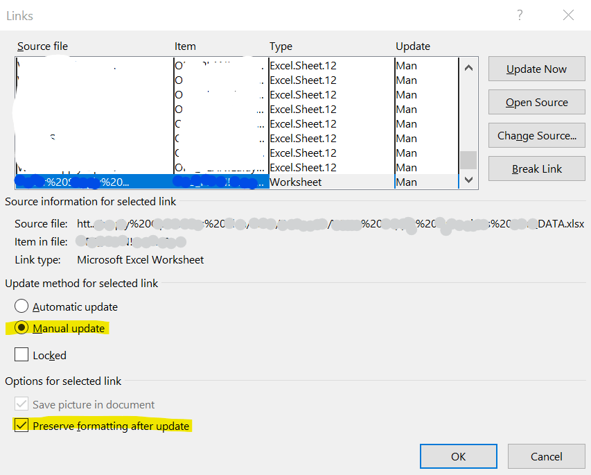After selecting Links from the menu, I change Update Method to Manual Update and select Preserve formatting after update.
