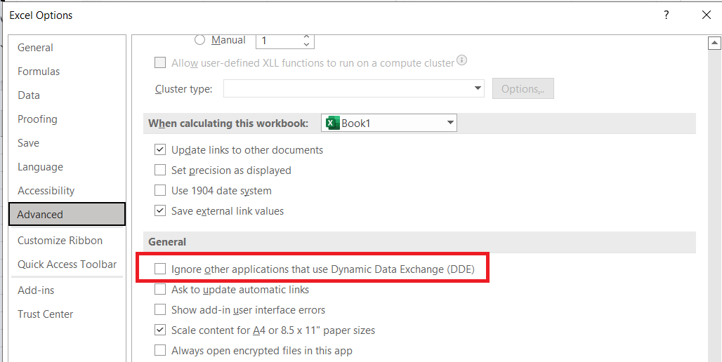 2.We notice you mentioned "we have already try disable in DDE", may I know if you have went to File>Options>Advanced>scroll down to General section and ensure the box for Ignore other applications that use Dynamic Data Exchange (DDE) is unchecked?