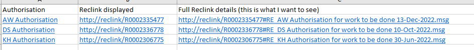 I have a spreadsheet with 400 lines that has in one column links reclinks of emails created in SharePoint. I need to display the full text of each hyperlink.