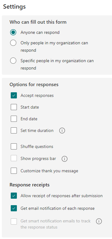 Sorry, but have another quick question. I set "Who can fill out this form" to "Anyone can respond". I notice with this setting it does not collect the name nor the email of the submitter. Is this standard? Do I have to use another setting to collect this info?