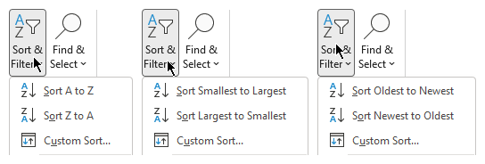 There are no separate Oldest to Newest and Newest to Oldest buttons. The captions of the sort buttons change with the type of data.