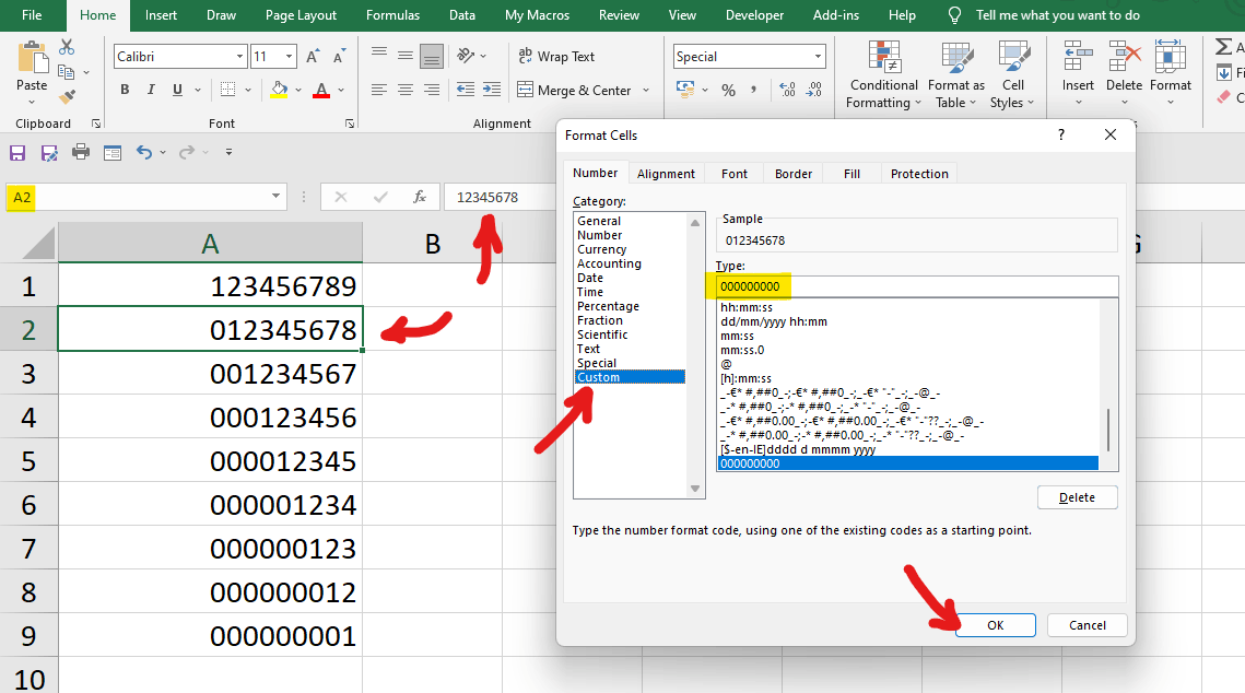 A "number" with a leading 0 is not a number in Excel, it is text...