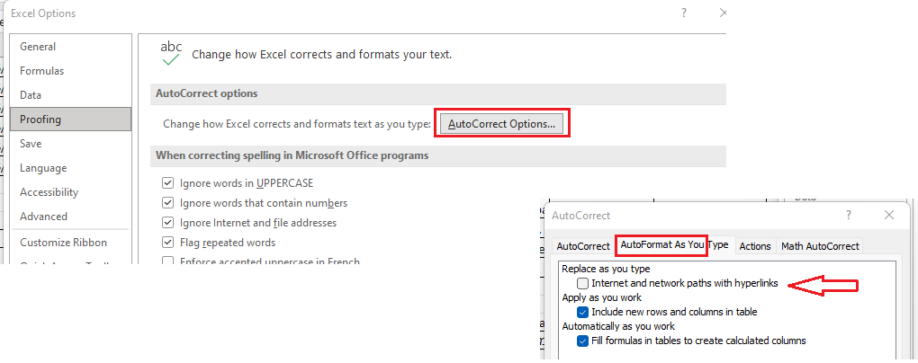- In the AutoCorrect dialog, click AutoFormat As You Type tab, and uncheck Internet and network paths with hyperlinks option under Replace as you type section.