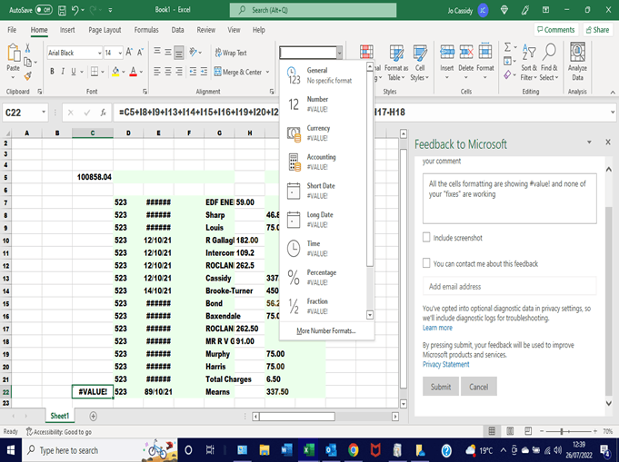 The drop down options are showing as #VALUE! because the cell you have highlighted has the #VALUE! within it. The dropdown shows the result that you would see from that cell's data for each formatting type. If you select another cell that has a valid value, the issue should go away.