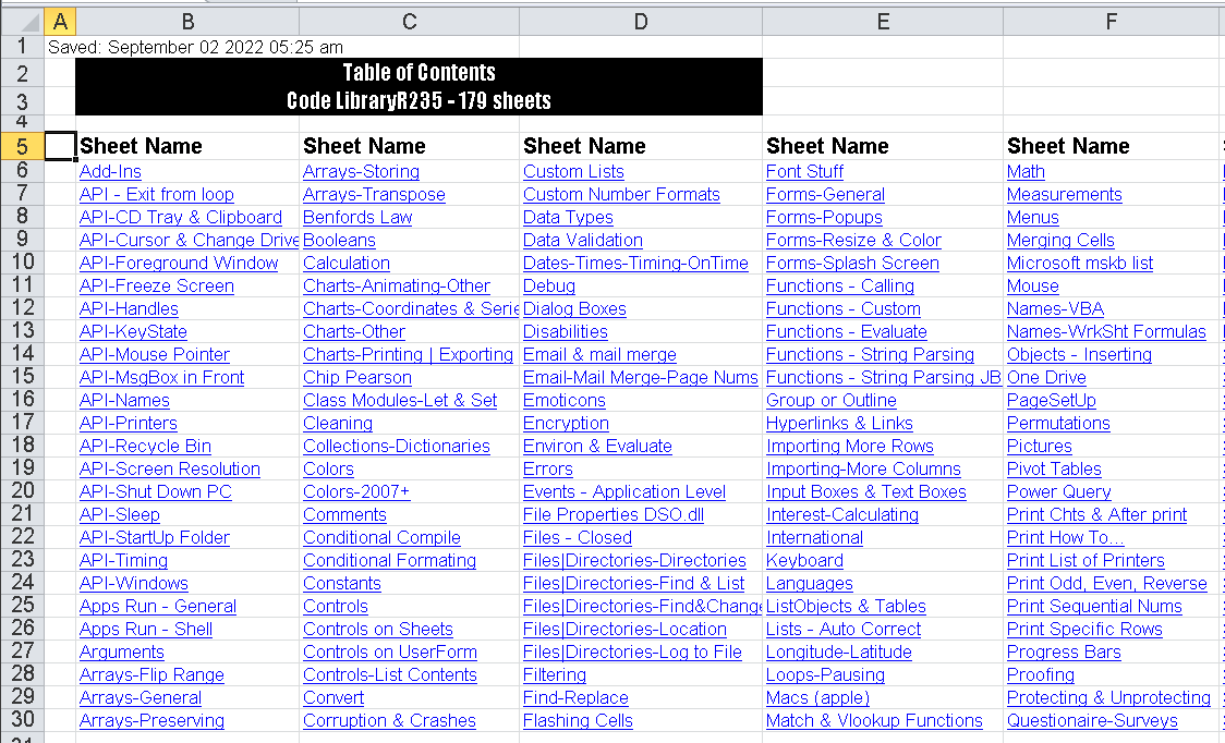 You may also be interested in the free 'Add Table of Contents' workbook.