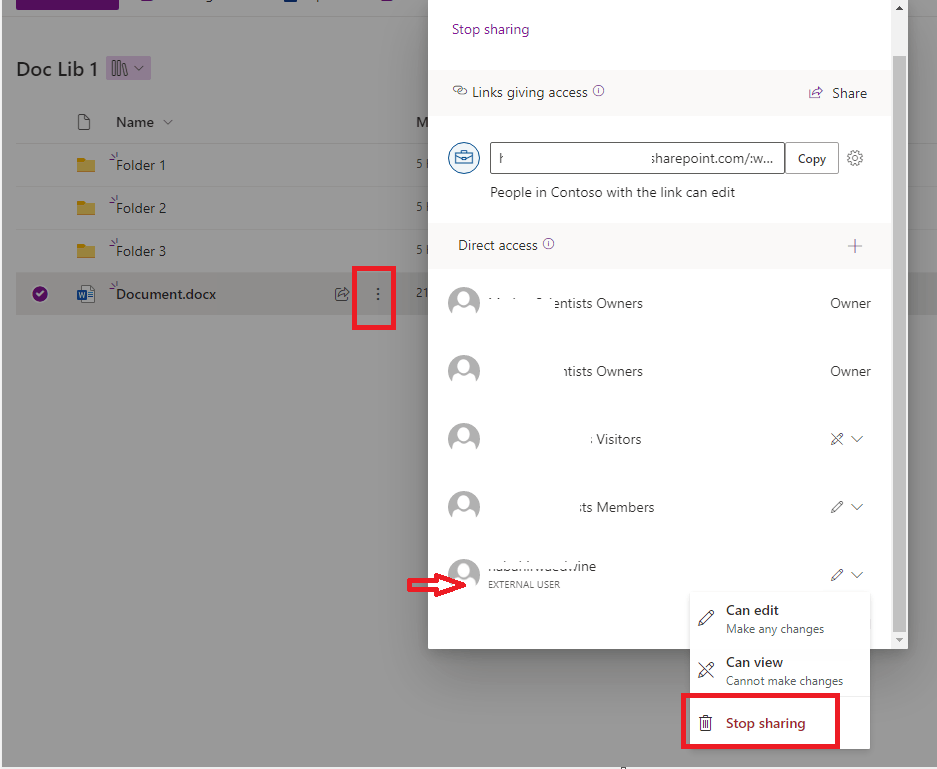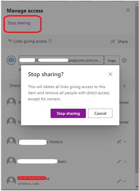 To check who have access to this file, click on the 3 dots ellipses (...) in front of that shared file > Manage Access . You will see a list of Groups and People who have access to this file. For example if there is an external user who has access to this file, you will see them, you can click on the drop down menu on that user > click Stop sharing.