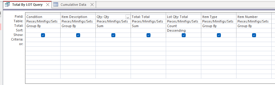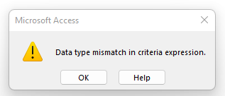 Please open the query in design view, and select SQL from the dropdown at the upper left. You'll get a window full of text which is the REAL query (the query grid is just a pretty nice but limited tool to build SQL strings). Copy and paste the SQL text to a message here. The original post error message is complaining about an incorrect datatype for a criterion - and the (portion of) the query grid doesn't show any criteria; I'd be they exist in the SQL.