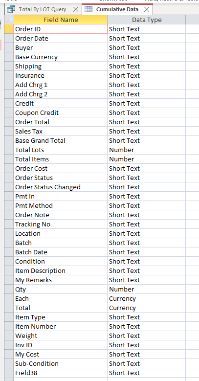 I've got several concerns about your datatypes. Short Text is the default and it's fine for text fields; but Dates should be in Date/Time fields, financial values like Sales Tax and Additional Charges should be Currency.