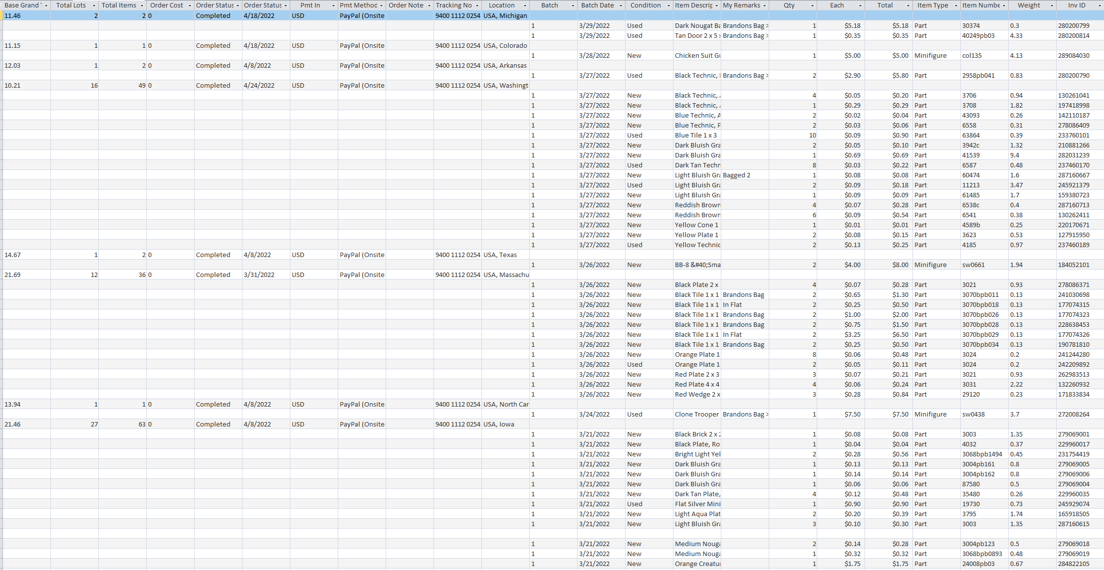2022-10-23T23:34:50+00:00 SELECT [Pieces/Minifigs/Sets].Condition, [Pieces/Minifigs/Sets].[Item Description], Sum([Pieces/Minifigs/Sets].Qty) AS Qty, Sum([Pieces/Minifigs/Sets].Total) AS Total, Count([Pieces/Minifigs/Sets].Total) AS [Lot Qty], [Pieces/Minifigs/Sets].[Item Type], [Pieces/Minifigs/Sets].[Item Number]