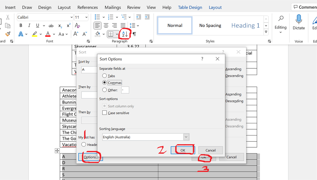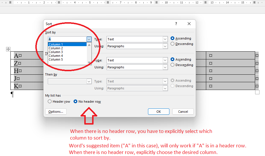 Stefan Blom 324.7K Reputation points MVP Volunteer Moderator2022-06-07T14:57:54+00:00 Indeed, Word is trying to be helpful and suggests the value in the top left cell as the item to "Sort by," and the sort will then fail because "Anaconda" in your most recent example (or "A" in our previous examples) is neither a label from a header row or a column number.