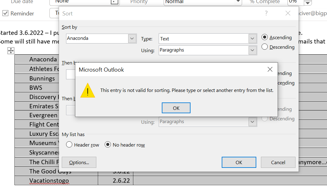 I inserted a table into an Outlook 365 Task but could not get it to sort. I found that selecting "Options" on the Sort, then OK on Sort Options before returning to OK on Sort worked. Pic might help...