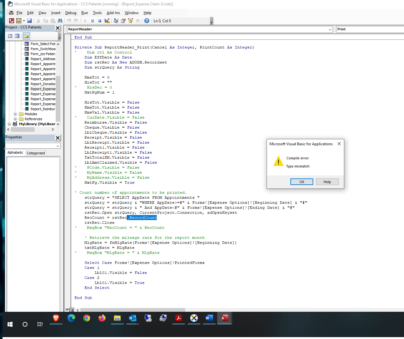 After recently upgrading from Office 2010 to Office 2021, a report fails with a type mismatch error. I've made no changes to the code, and it still works in Access 2010. In addition to the code below, RecCount is declared Public Integer.