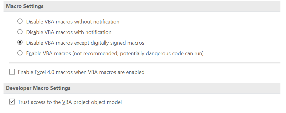 2. I have thereafter gone and checked the Trust Center and selected the following options as was the case previously: