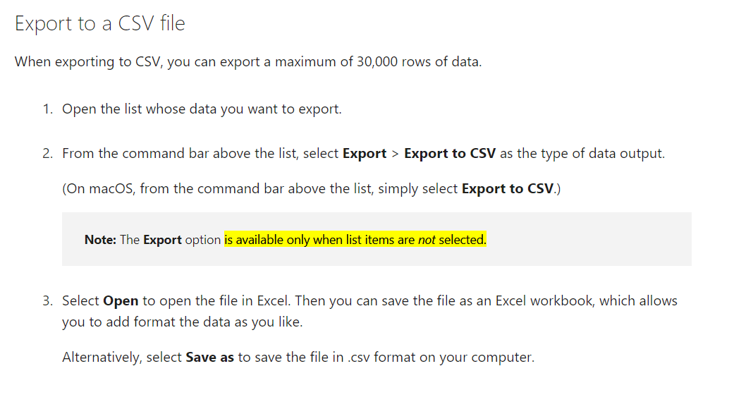 Please let us request this from the Developers Team. I submitted a request. Please also add your vote via this link: Please make it possible to Export filtered Microsoft list records to Excel without first going to Edit the current list view. · Community. Developers Team are the managers of this website and are constantly checking it for customer feedback. I am sure they will work on this ASAP. Customer feedback is very important to Microsoft.
