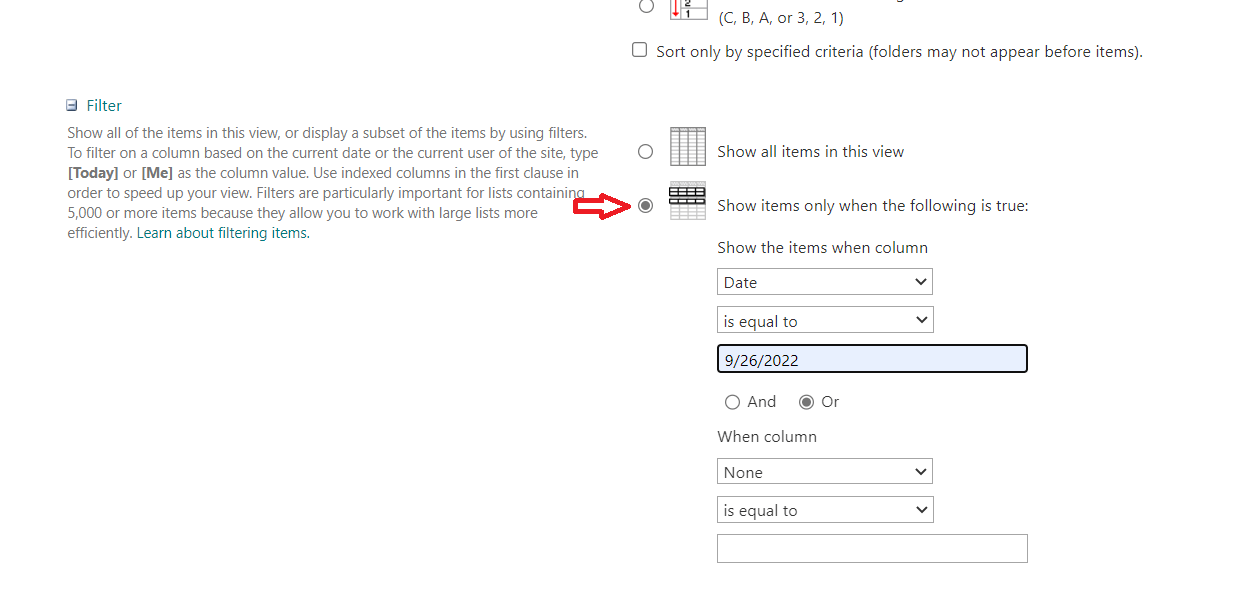 Note: After Editing a list and applying those filter settings, to go back to your full list records, you will need to remove those applied filters following the same steps. For example, ticking "Show all items in view". in the above screenshot or simply deleting and selecting None.