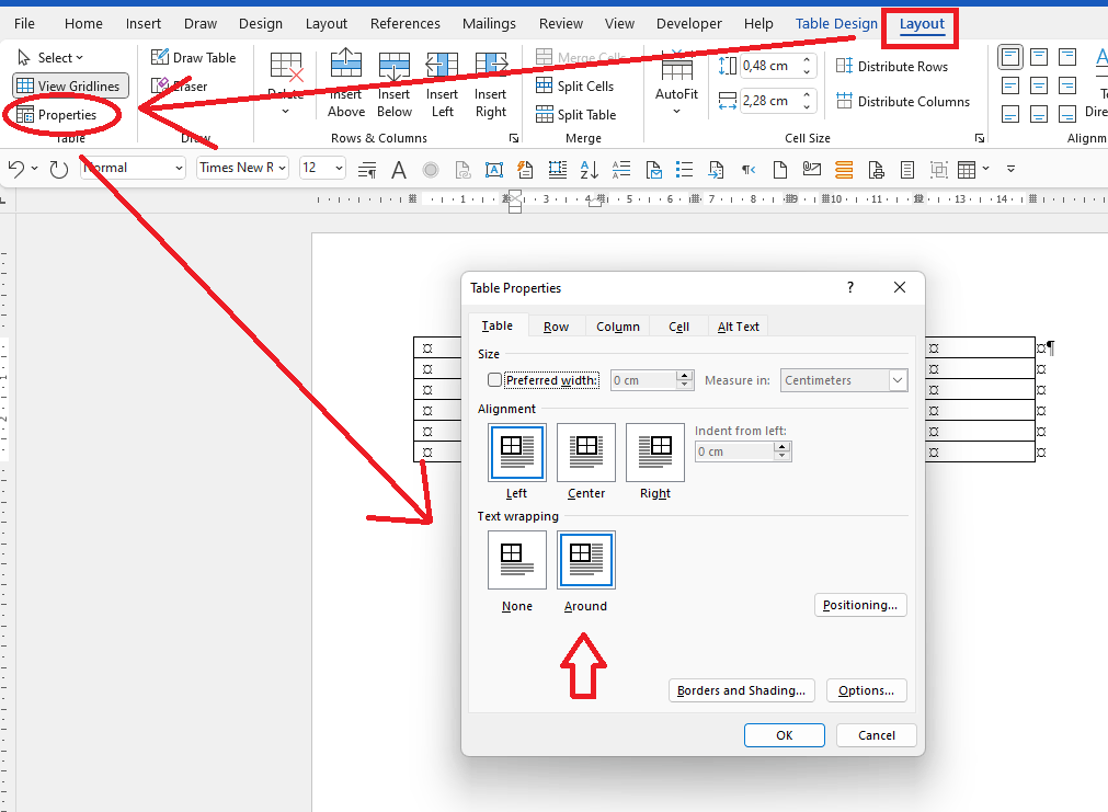 Is the Text Wrapping set to "Around" in the Table Properties dialog box?