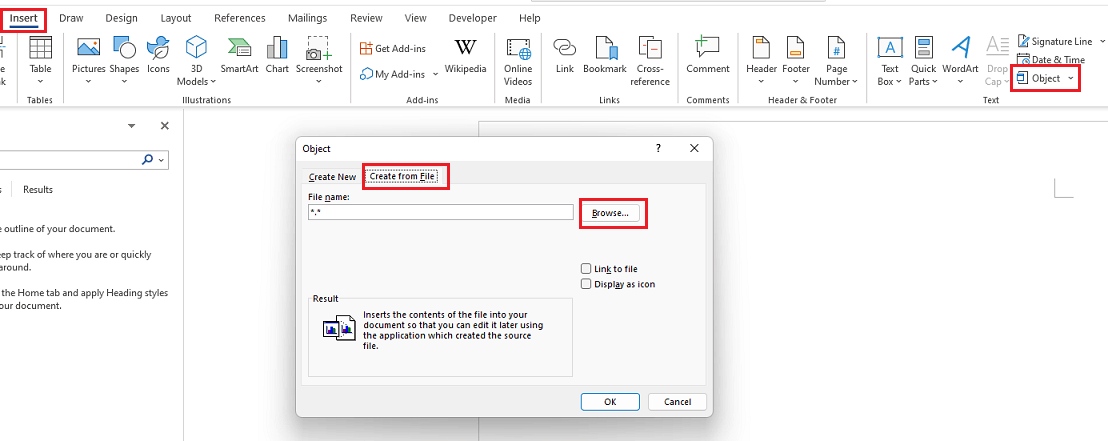 If you are using Word for Web, it is not available to insert other files.