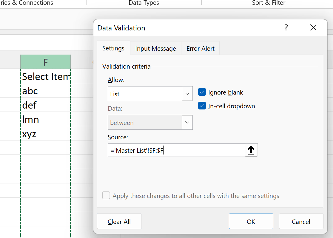 Select “Ok” button to complete the data validation.
