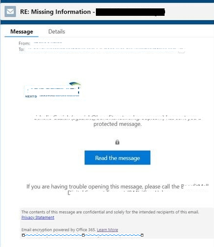 As far as how the email was encrypted, I believe it's an Office 365 Message Encryption. There's an attachment "message_v4.rpmsg" which I'm not able to open. I'm not sure if my answers are helpful in resolving this issue. I do have an open ticket with our Service/IT Dept but haven't received a reply yet. Thank you.