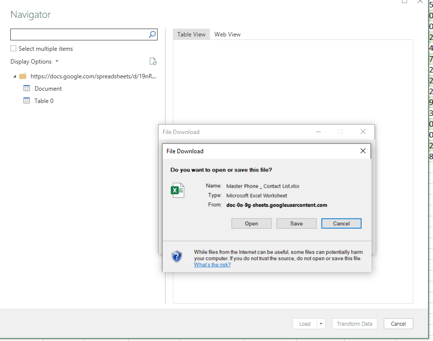 Thank you for the research in helping me resolve this. The changes seem to bypass the error. I'm back to my original challenge. Instead of loading the data into my query, it is trying to download the entire sheet. Regardless of me saving or canceling the download, the Navigator for power query will return "document" and won't populate the sheet names or tables. I must have the link correct, because it downloads the correct file. My permissions must be good as well. I've been searching for settings that cause the download instead of loading the data.
