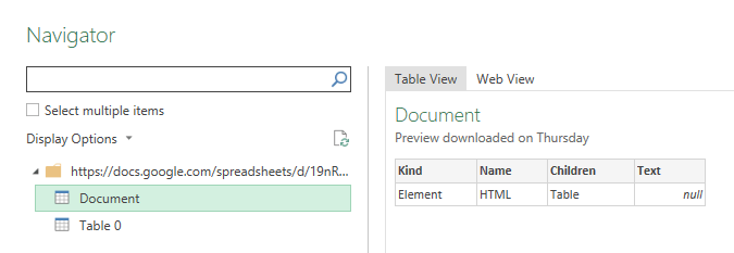 Here is what my navigator shows. I'm unable to load the google sheets data into power query. It seems that the download of the file cancels the navigation to the webpage. Any suggestions on what I'm doing wrong?
