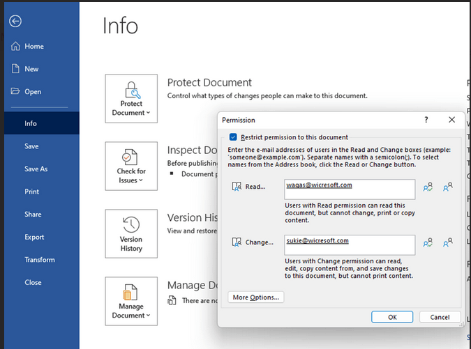 - For the Restrict Access function in Word, if you want to use Restrict access function to documents, you should Restrict access to documents with Information Rights Management in Word, which installation to be used. For your reference: Restrict access to documents with Information Rights Management in Word (microsoft.com)
