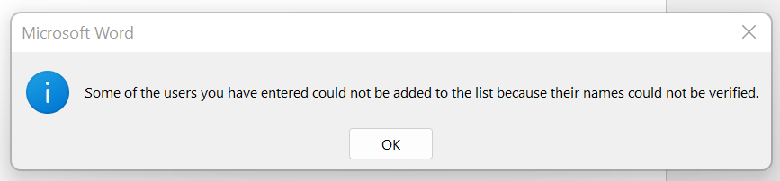 Based on your description, it seems that when you use the Restrict Editing function in Word and type the user name you got the error message.