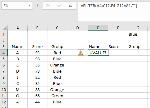 =FILTER(A4:C12, C4:C12=G1, "")