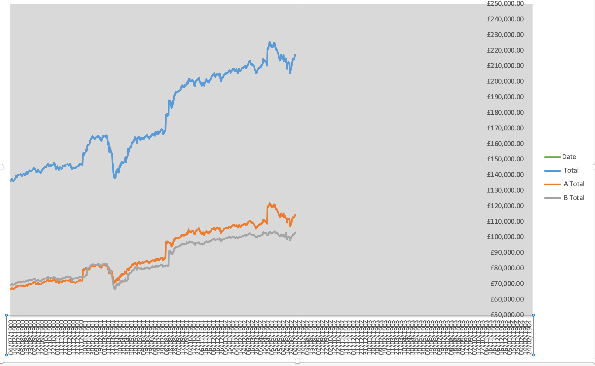 But if you look at the Rowan Dartington sheet, you'll see that the data extend to row 918. If you change the Chart data range to