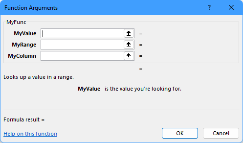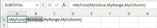 Function MyFunc(MyValue As Variant, MyRange As Range, MyColumn As Long) ' code goes here ... ... End Function