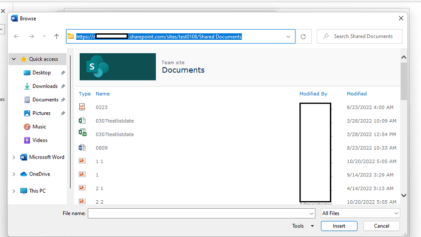 - Since you mentioned the situation won't happen when you insert a local file as an Object, I would like to know more details about how you insert the SharePoint/OneDrive file. May I know if you have installed the OneDrive client and inserted the online files by selecting them from the OneDrive local sync folder in the File Explorer? If so, what if you paste the URL directly in the File Explorer as shown in the screenshot below, do these error messages pop on again?