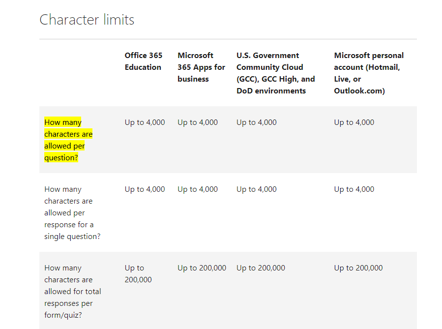 I found an article about this question. Kindly refer to this article and the screenshot below: Form, question, response, and character limits in Microsoft Forms