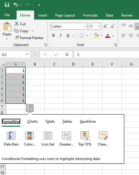 But now, when you drag the fill handle, it look like this and goes 1,1,1,1,1,1,1